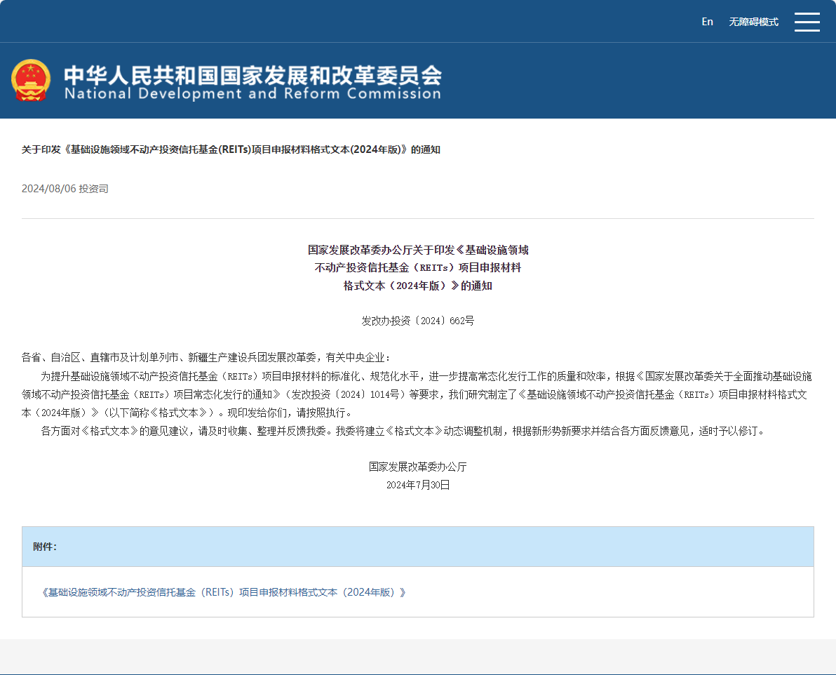 国家发展改革委办公厅关于印发《基础设施领域不动产投资信托基金(REITs)项目申报材料格式文本(2024年版)》的通知 发改办投资〔2024〕662号各省、自治区、直辖市及计划单列市、新疆生产建设兵团发展改革委,有关中央企业:  为提升基础设施领域不动产投资信托基金(REITs)项目申报材料的标准化、规范化水平,进一步提高常态化发行工作的质量和效率,根据《国家发展改革...